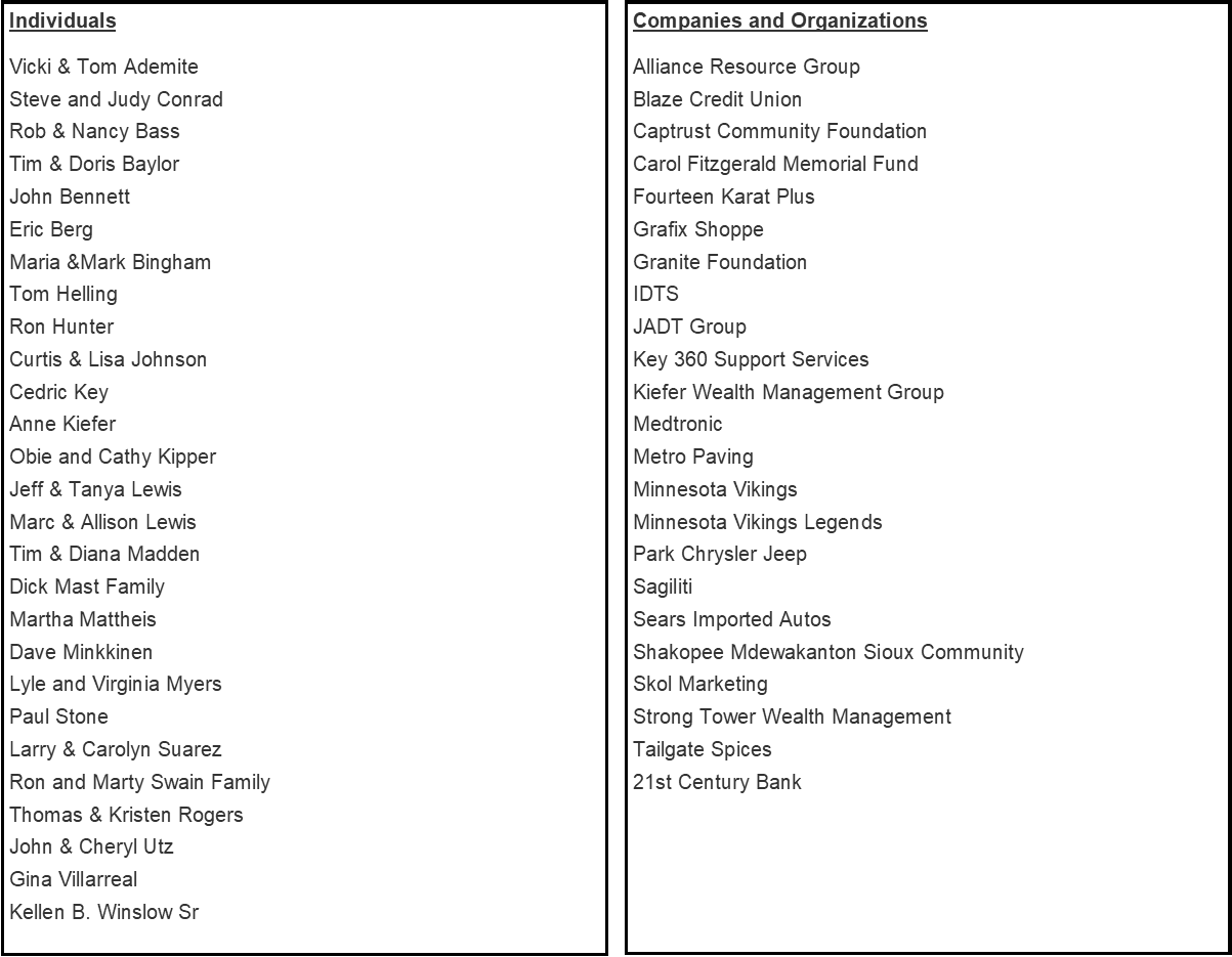 We would like to thank the following persons and companies for their outstanding/longstanding support of the Lewis Sports Foundation. This recognition is in memory of Ron Swain, long-time friend of the Lewis family and ardent supporter of the Lewis Sports Foundation since its inception in 1999.